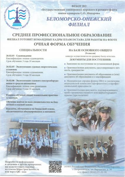 Беломорско-Онежский филиал ФГБОУ ВО «Государственный университет морского и речного флота имени адмирала С.О. Макарова» приглашает выпускников 9-х классов на обучение по программам среднего профессионального образования по следующим специальностям: